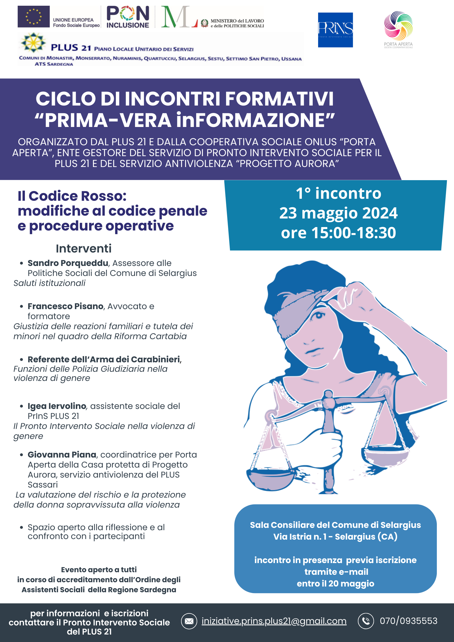 Il Plus 21 in collaborazione con la Cooperativa Sociale Onlus "Porta Aperta", ente gestore del Pronto Intervento sociale Plus 21,organizza un evento formativo presso l'Aula consiliare di Selargius il 23 maggio 2024 h 15:00 -18:30 sulla tematica del codice rosso. Per informazioni e iscrizioni contattare il Prins: