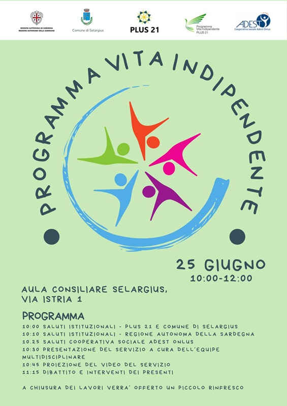 La cittadinanza è invitata all'evento conclusivo e divulgativo dell'esperienza "Vita Indipendente e inclusione nella società delle persone con disabilità" organizzato per la prima volta nel Plus 21 e al quale hanno preso parte n. 10 cittadini dell'ambito territoriale. L'iniziativa si terrà martedi 25 giugno 2024 dalle 10,00 alle 12,00 presso la sala consiliare del Comune di Selargius, sita in Via Istria n. 1
