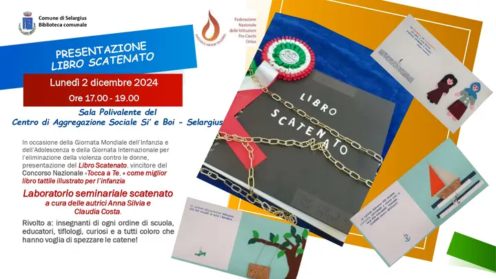 Lunedì 2 dicembre alle ore 17 presso la sala Polivalente di Piazza Si'e Boi ci sarà la presentazione di: "Libro Scatenato di Anna Silvia e Claudia Costa", libro tattile illustrato, in Braille, vincitore del Concorso Nazionale «Tocca a Te » come miglior libro tattile illustrato per l’infanzia.