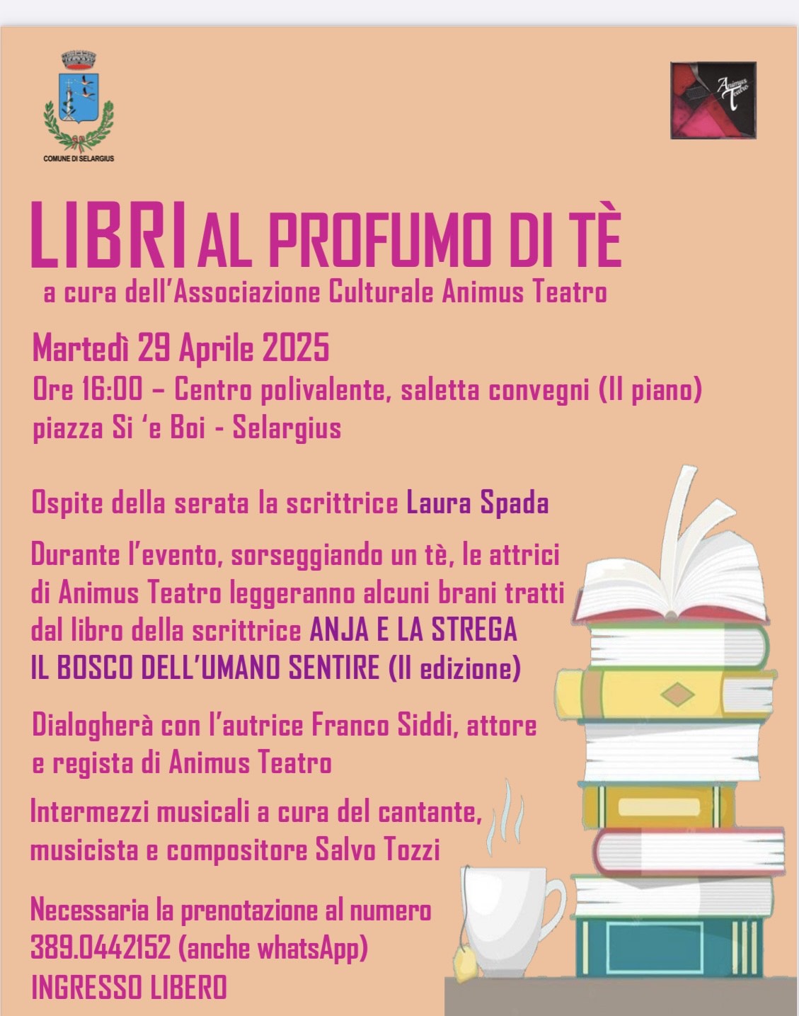Martedì 29 Aprile appuntamento con la rassegna letteraria “Libri al profumo di tè" a cura dell’Associazione Culturale Animus Teatro per presentazione del libro “Anja e la strega- Il bosco dell’umano sentire” della scrittrice Laura Spada.