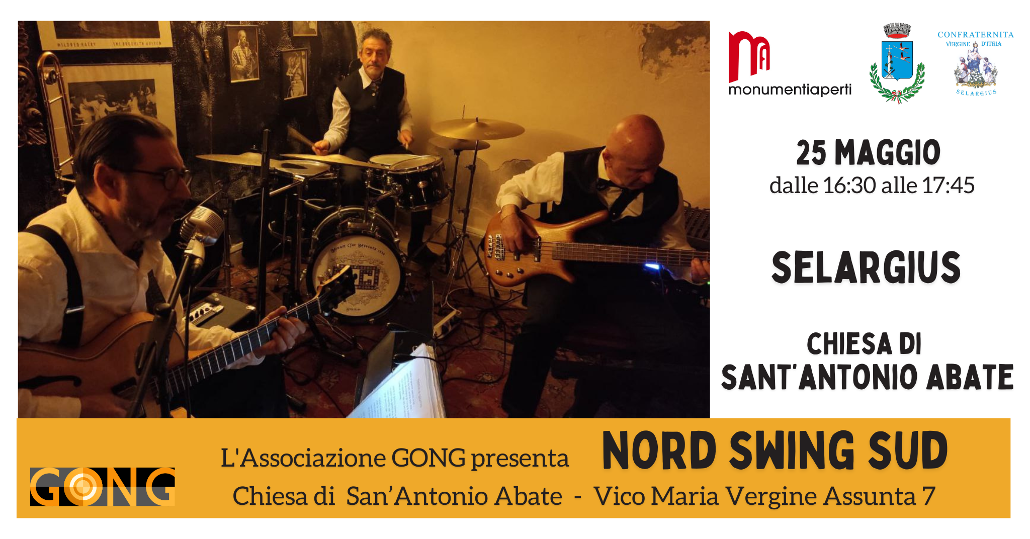 Domenica 25 maggio dalle 16:30 alle 17:45 *l'Associazione GONG* presenta il concerto *"Nord Swing Sud"* , un repertorio che ripercorre l'evoluzione dello Swing Italiano a partire dagli anni '50 diretto da *BOB MONTALBANO*.