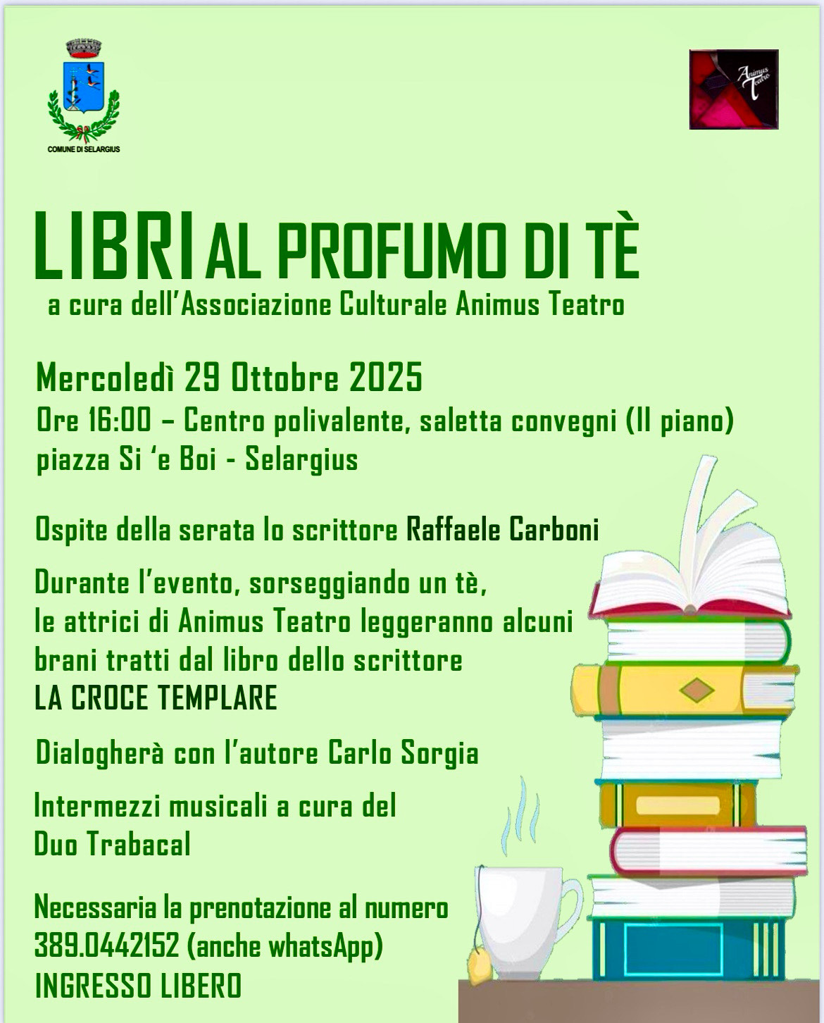 Mercoledì 29 Ottobre 2025 alle ore 16.00 appuntamento con la rassegna letteraria “Libri al profumo di tè" a cura dell’Associazione Culturale Animus Teatro.