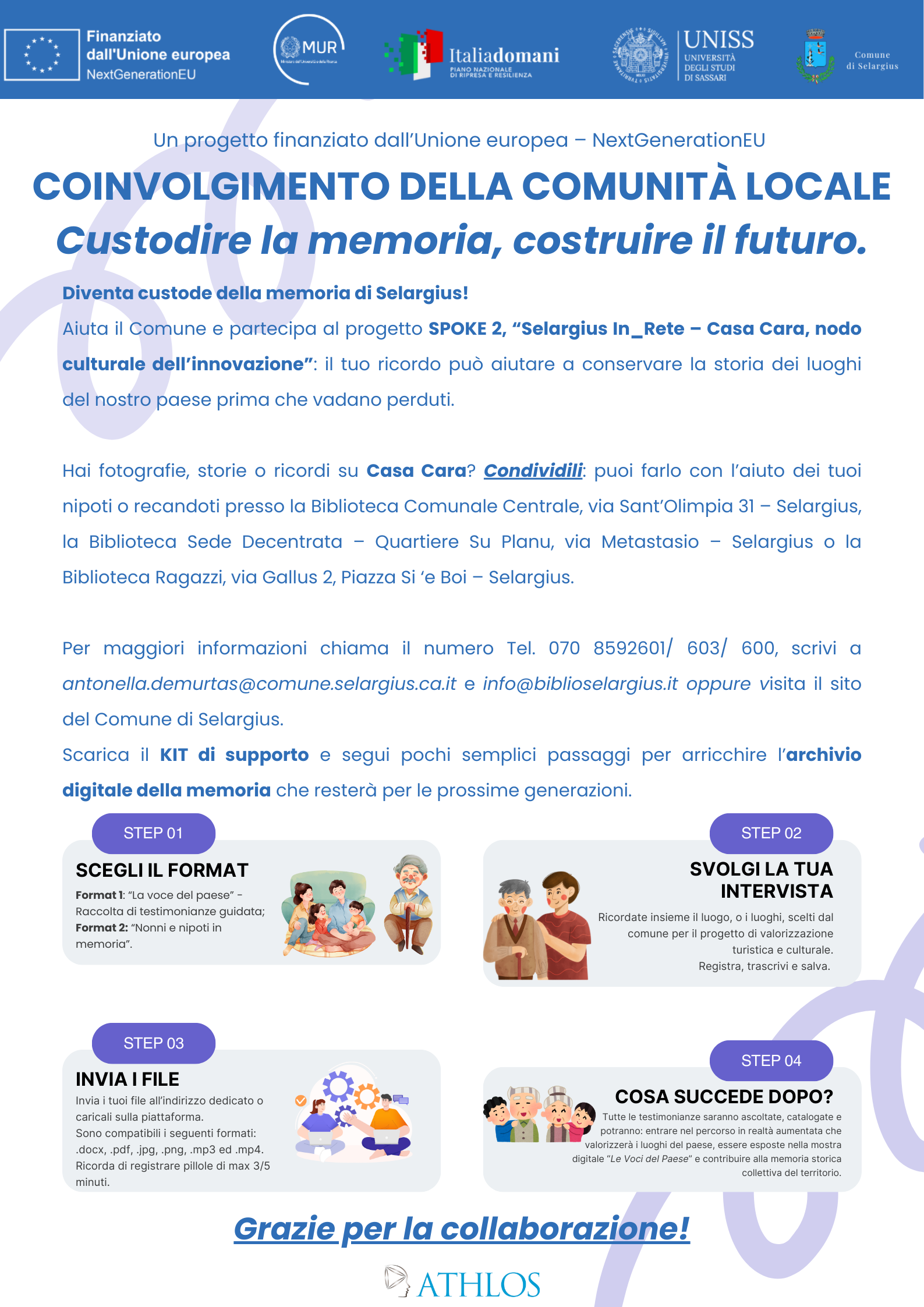 Il Comune di Selargius invita tutti i cittadini e tutte le cittadine a prendere parte all’iniziativa “Nonni e Nipoti in Memoria”, parte del più ampio progetto di valorizzazione culturale del territorio, finanziato dall’Unione europea – NextGenerationEU, attraverso l’uso della realtà aumentata e dell’intelligenza artificiale.