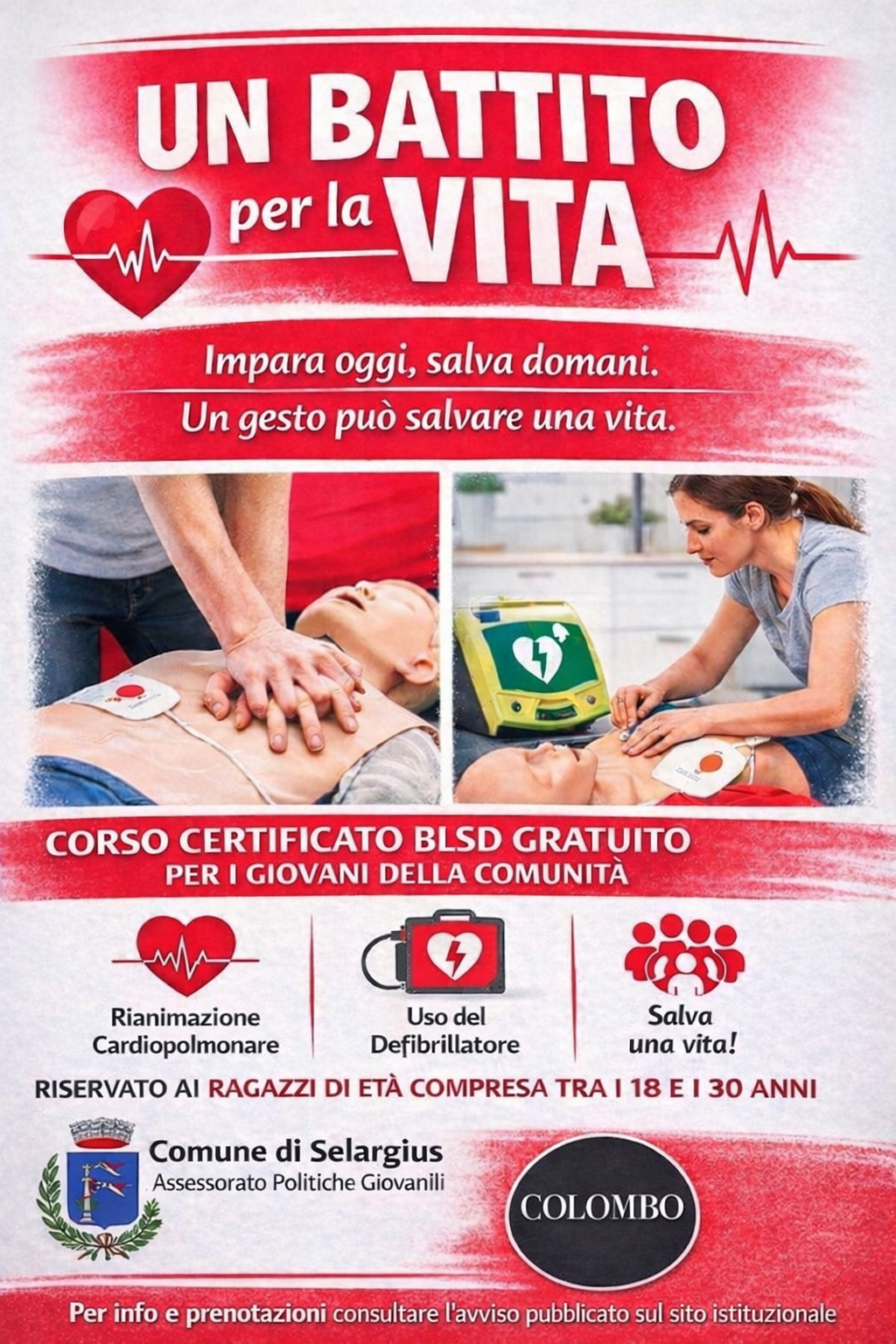 L'Amministrazione Comunale , Assessorato Politiche Giovanili riapre i termini di iscrizione al corso manovre salvavita disostruzione vie aeree e uso del defibrillatore. Il corso è gratuito e rivolto ai giovani dietà compresa dai 18/30 anni fno ad un massimo di 100 posti. Maggiori dettagli sono indicati nell'avviso. Le domande potranno essere inoltrate, accedendo all'apposito link indicato nell'avviso. .